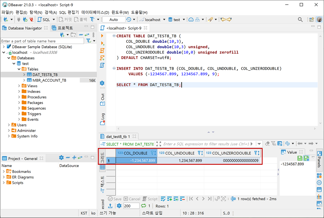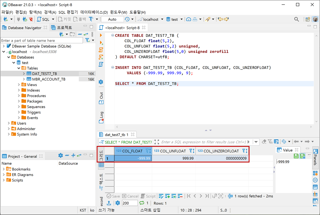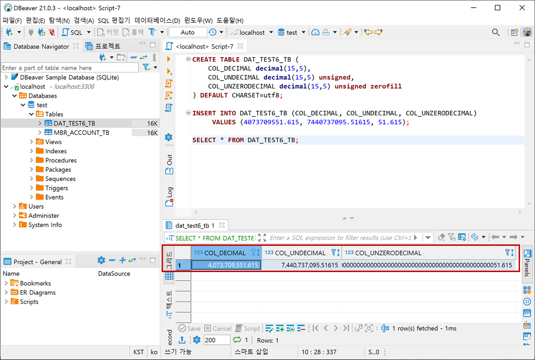 테스트를 위해 SIGNED과 UNSIGNED은 (M)을 10으로 (D)을 3으로, UNSIGNED ZEROFILL은 (M)을 10으로 (D)을 0으로 설정하였습니다.