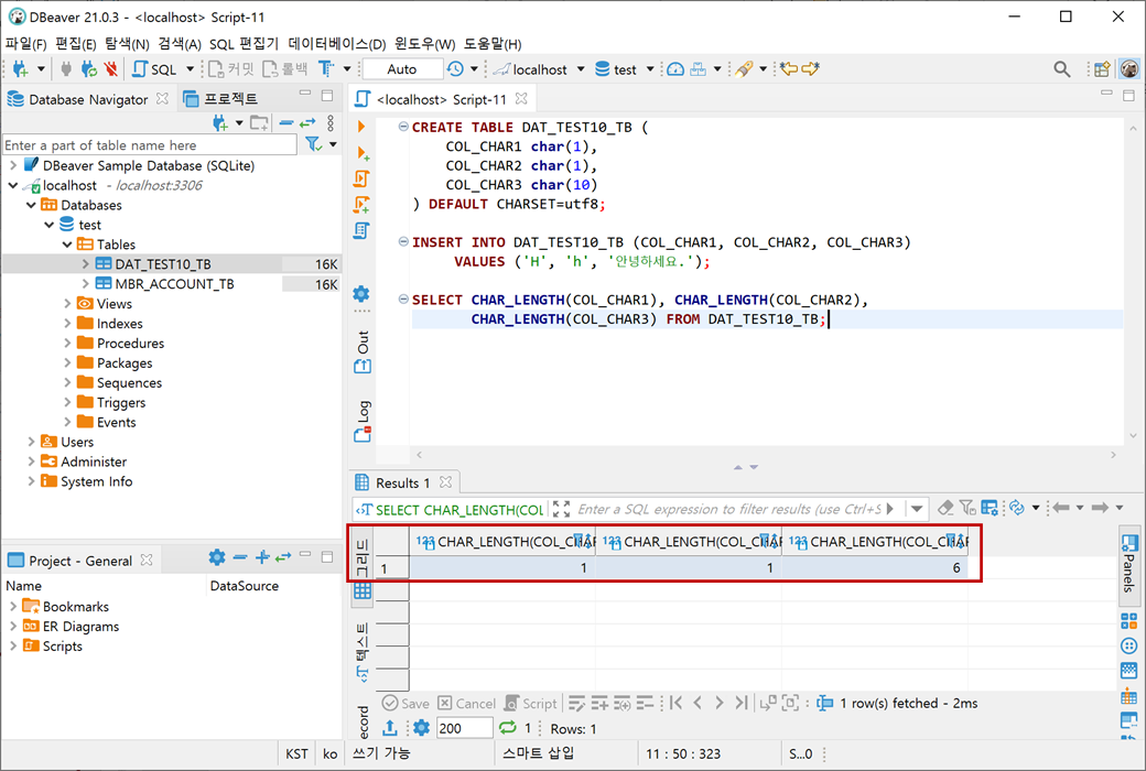 다시 쿼리문을 실행하면 COL_CHAR3의 문자 길이가 10으로 나옵니다.