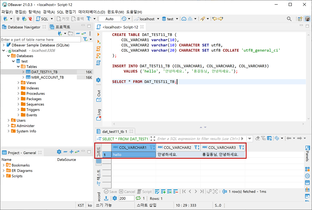 위에서 테이블 생성시 테이블의 Charset이 UTF8로 설정하였기 때문에 에러는 발생하지 않습니다.