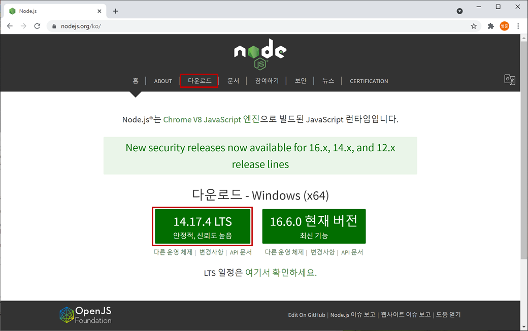 1. Node.js 사이트(https://nodejs.org/ko/)를 접속합니다.