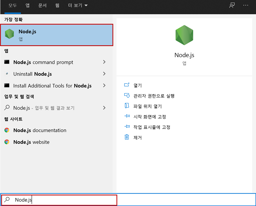 또는 윈도우 "시작"(start) 버튼을 클릭하고 "스페이스 바"(Space Bar)을 클릭합니다. 입력창에 "Node.js"입력 후 "Node.js"를 클릭합니다.