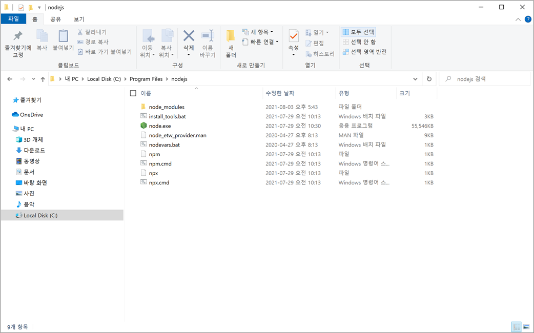 C:\Program Files\nodejs에 정상적으로 설치되었습니다.