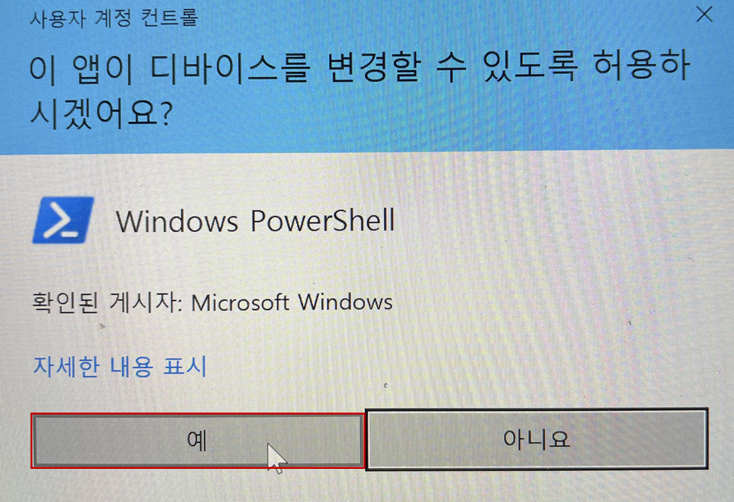 윈도우 파워셀에서 실행하기 위해 "이 앱이 디바이스를 변경할 수 있도록 허용하시겠어요?"의 보안 확인 창이 나타나면 "예"버튼을 클릭합니다.