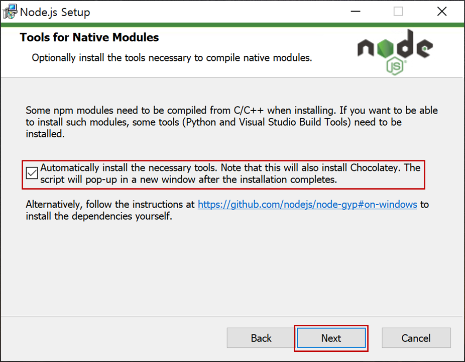 기본 모듈을 컴파일하는 데 필요한 도구들을 자동으로 설치하기 위해 체크하고 "Next"버튼을 클릭합니다.