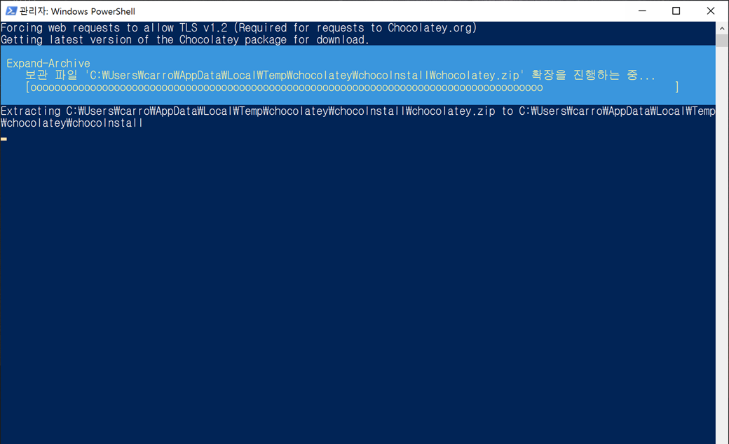 그러면 Chocolatey이라는 프로그램도 설치됩니다. Chocolatey는 윈도우에서 소프트웨어를 쉽게 설치하고 업데이트하고 삭제까지 처리해 주는 프로그램입니다.