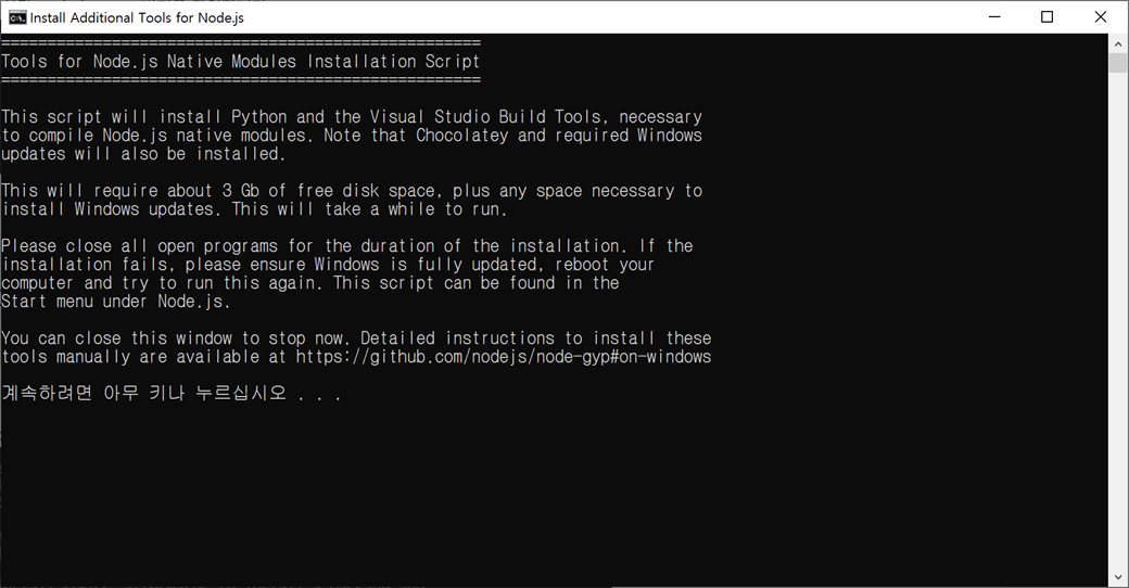 기본 모듈을 컴파일하는 데 필요한 도구들을 자동으로 설치하기 위해 콘솔 창이 오픈됩니다. 진행을 위해 아무 키나 누릅니다.