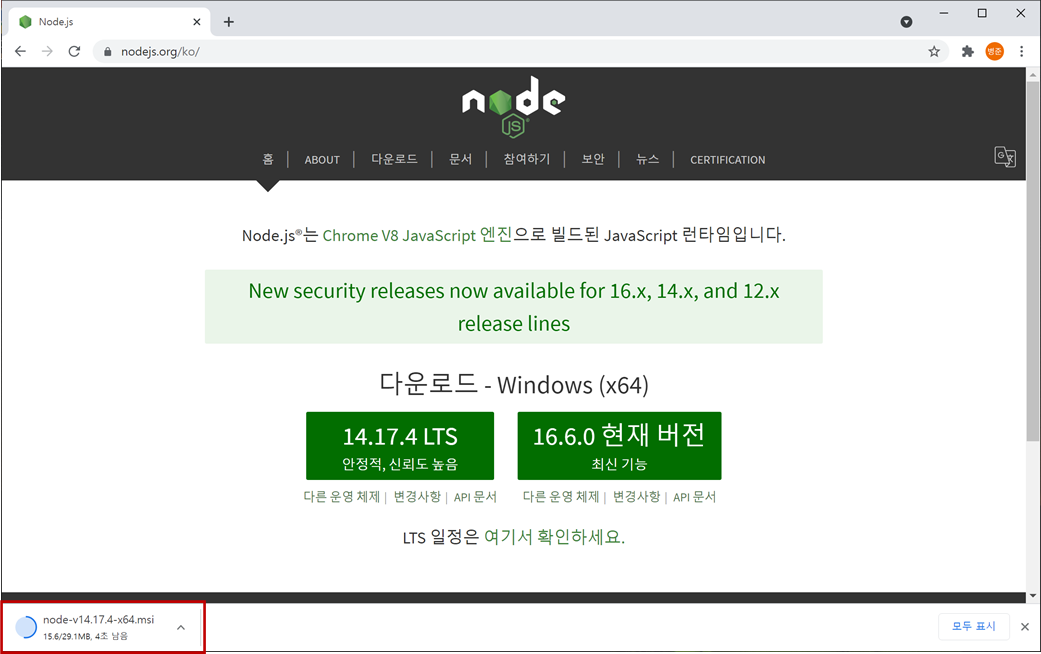 작성 당시 버전은 "14.17.4 LTS"입니다.