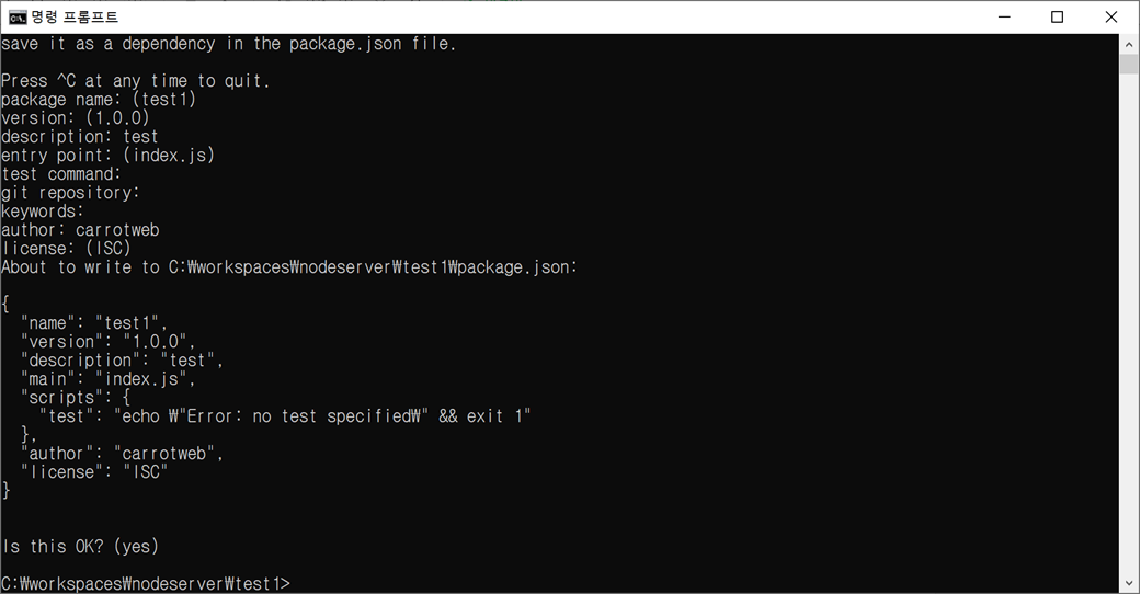C:\workspaces\nodeserver\test1 폴더에 package.json 파일이 생성됩니다.