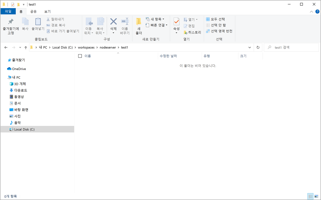 1. C:\workspaces\nodeserver\test1 폴더를 생성합니다.