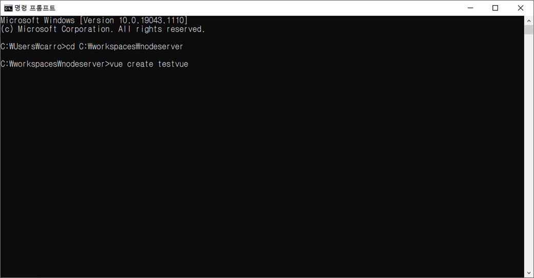 2. Vue 프로젝트를 생성하기 위해 vue create 명령어를 실행합니다. Vue 프로젝트 명은 "testvue"입니다.