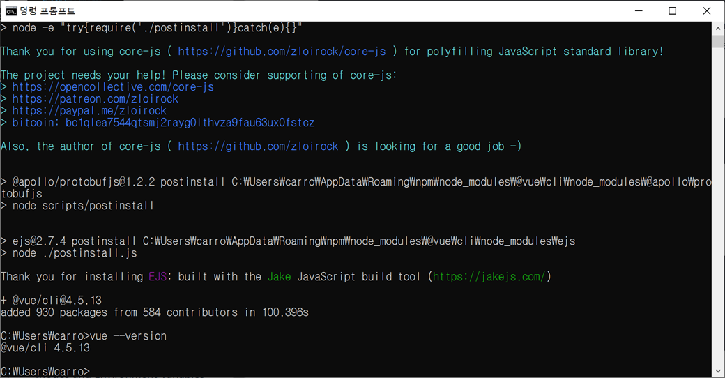 1. 콘솔을 실행하고 Vue CLI를 설치하기 위해 npm install 명령어를 실행합니다.