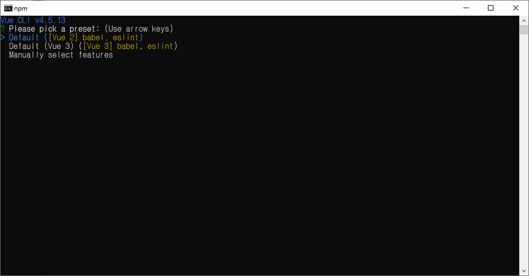 Vue 프로젝트를 어떻게 구성할 건지 preset(프리셋 : 사전 설정)합니다. 키보드의 화살 키로 위/아래로 이동할 수 있습니다.