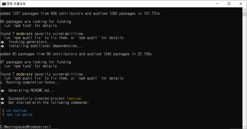 testvue 폴더가 생성되고 1340개의 모듈 설치와 Vue 프로젝트 관련 파일들이 생성되어 완료됩니다.