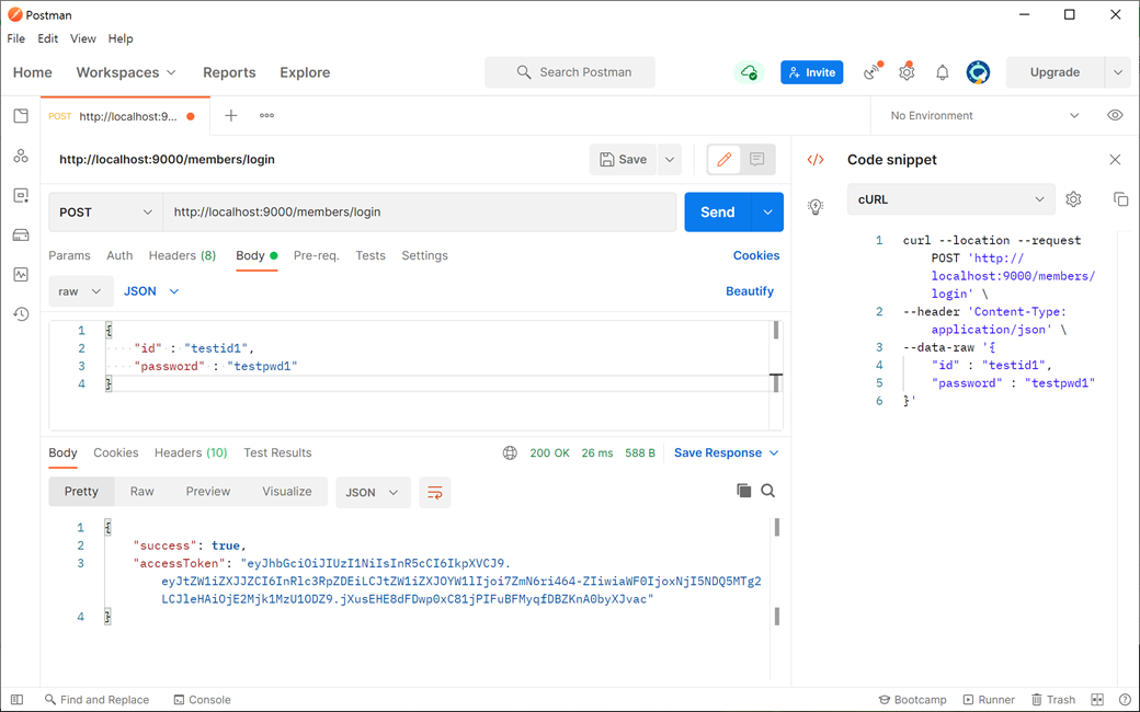 아이디와 패스워드로 로그인 처리되어 리턴 값에 success가 true이고 accesToken에는 생성된 JWT를 가져옵니다.