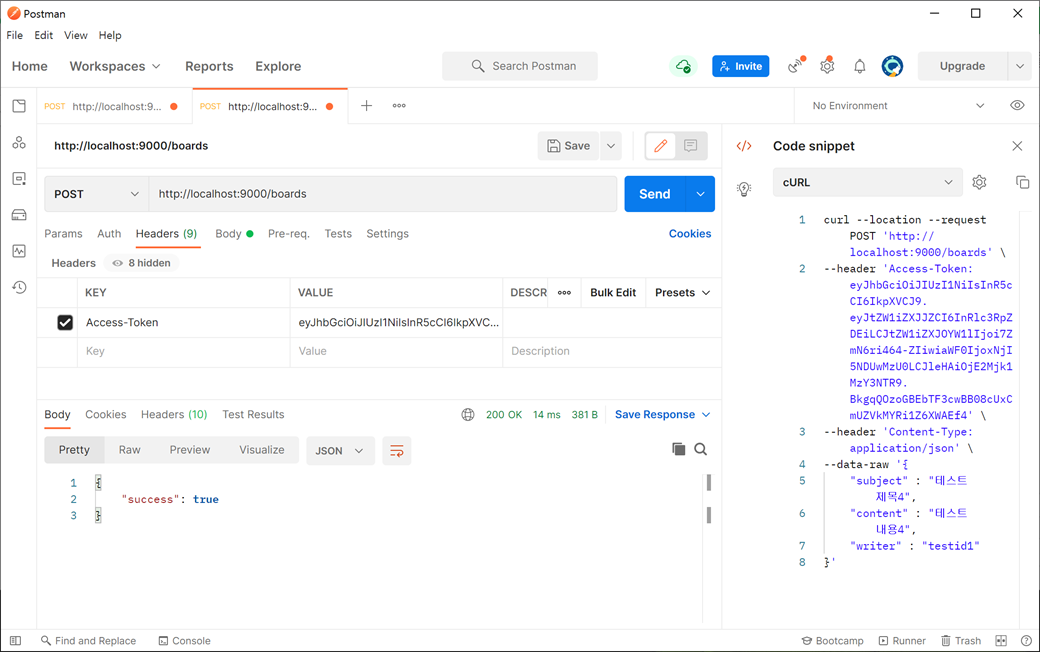 헤더 KEY에 "Access-Token"를 추가하고 VALUE에 위에서 생성된 JWT를 추가하고 다시 게시판에 새로운 게시물을 등록하기 위해 POST Method로 호출합니다.