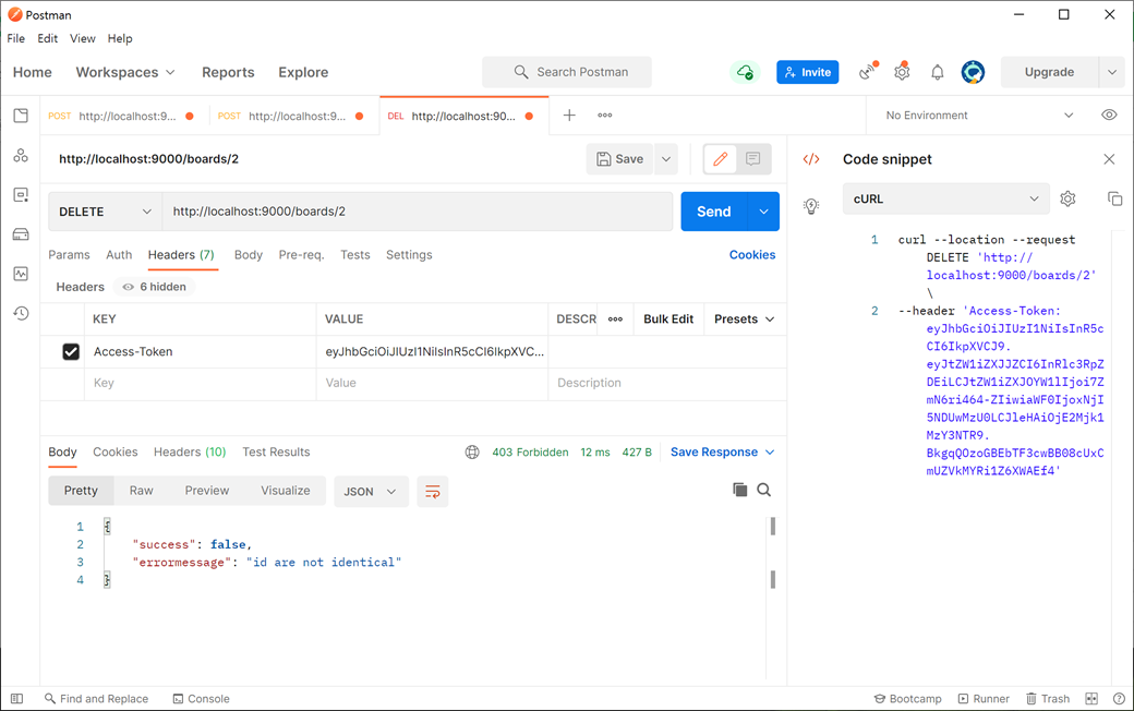 등록된 게시물 작성자(writer)와 인증된 로그인 사용자의 아이디(req.tokenInfo.memberId)를 같지 않으면 처리되지 않고 "id are not identical"라고 리턴됩니다.