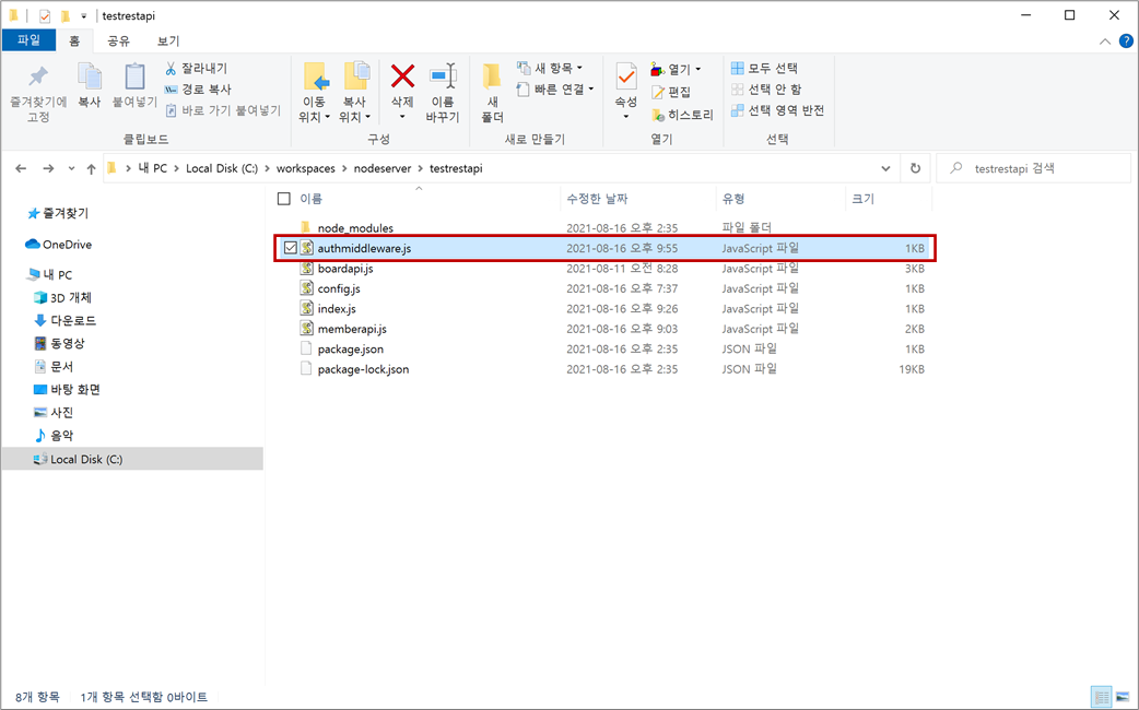 1. C:\workspaces\nodeserver\testrestapi 폴더에서 JWT를 검증(확인) 하기 위한 미들웨어를 만들기 위해 authmiddleware.js 파일을 생성합니다.