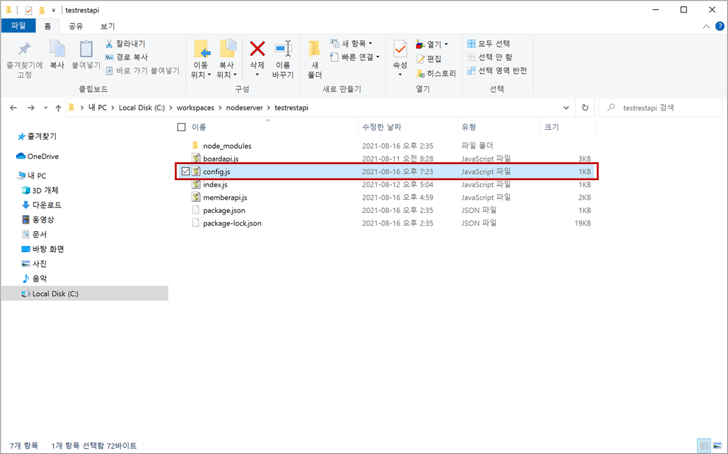 2. C:\workspaces\nodeserver\testrestapi 폴더에서 환경 설정 정보를 관리하기 위해 config.js 파일을 생성합니다.