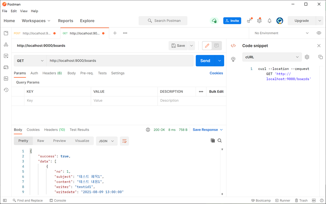 4. Postman(포스트맨)를 실행하여 게시판 리스트를 가져오기 위해 GET Method로 호출합니다.