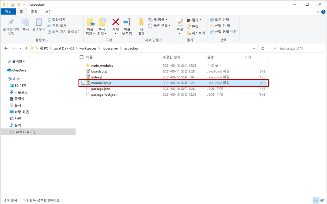 1. C:\workspaces\nodeserver\testrestapi 폴더에서 회원 로그인과 인증 처리를 위한 REST API를 만들기 위해 memberapi.js 파일을 생성합니다.