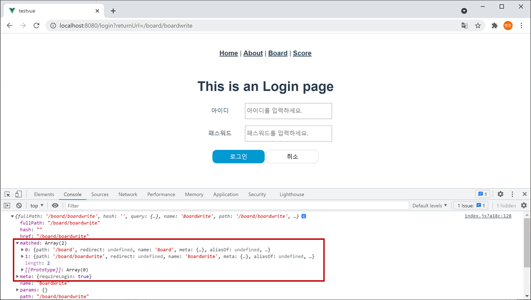 다음처럼 상위 라우트에 meta 필드로 { requireLogin: true }가 있도 동일하게 처리됩니다. 그러나 게시판 전체가 Login 되어야 접근할 수 있게 됩니다.