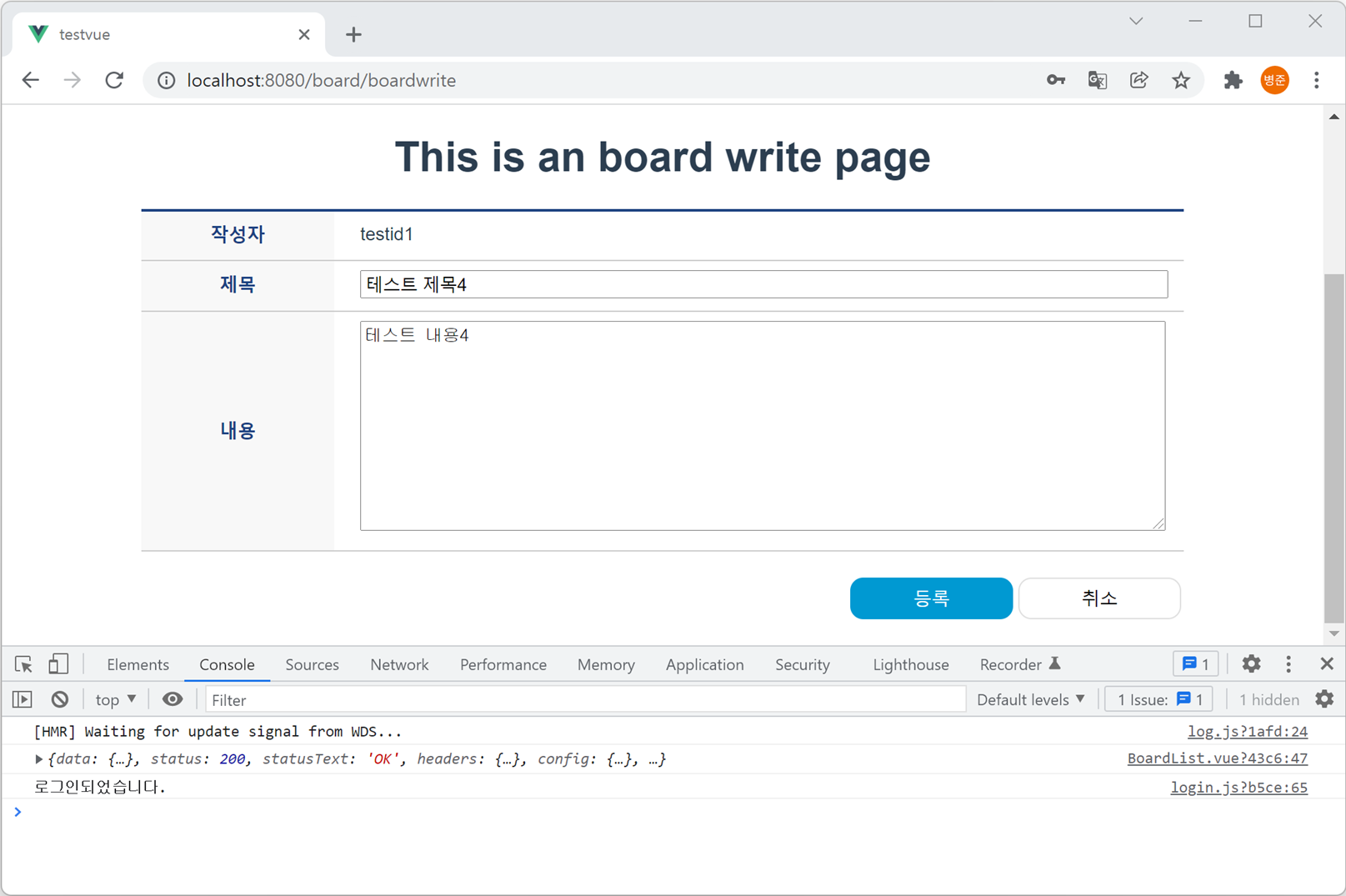 9. 다시 웹 브라우저에서 "http://localhost:8080/board"를 입력합니다. 그리고 쓰기 버튼을 클릭합니다. Login 페이지에서 아이이와 패스워드를 입력하면 게시물 작성 페이지로 이동됩니다. 테스트를 위해 제목에 "테스트 제목4", 내용에 "테스트 내용4"를 입력하고 10분 후 등록 버튼을 누릅니다. (만약 오류가 발생하면 Vue 종료하고 다시 실행합니다.)