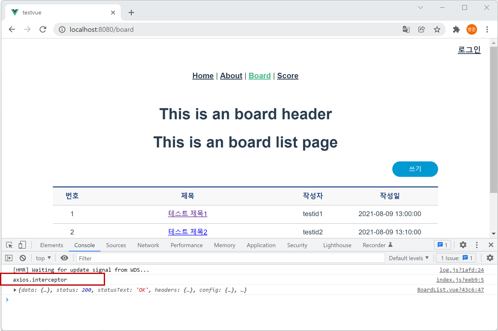 그리고 쓰기 버튼을 클릭하고 Login 페이지에서 로그인한 후에도 콘솔에 "axios.interceptor"가 출력됩니다.