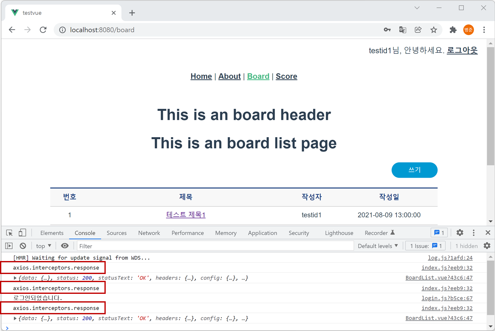 3. 웹 브라우저에서 "http://localhost:8080/board"를 입력합니다. 그러면 응답할 때마다 콘솔에 "axios.interceptors.response"가 출력되는 것을 확인할 수 있습니다.