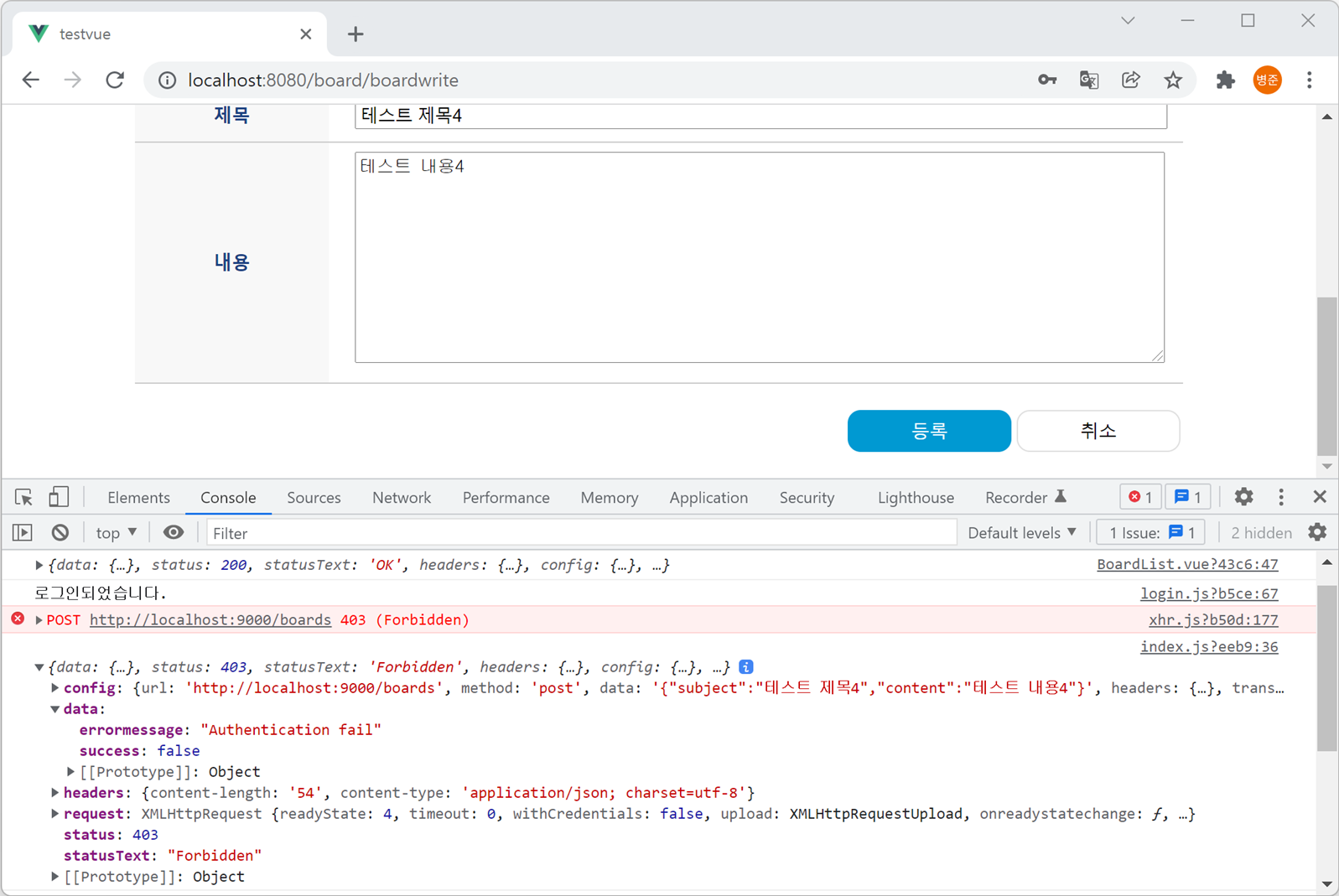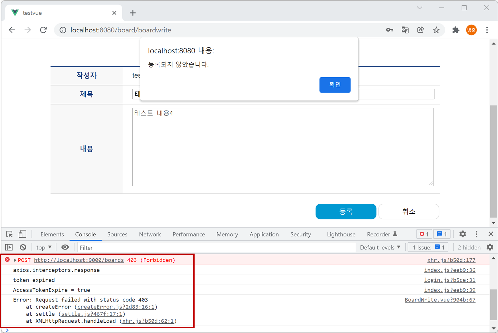 4. 10분 후 게시판 쓰기 페이지로 이동한 후 제목과 내용을 입력하고 저장 버튼을 클릭합니다. 그러면 accessToken이 만료되어 콘솔 로그에 출력됩니다. 그리고 레스트 API 서버로 403 응답 코드로 응답이 들어오는 것을 확인할 수 있습니다.