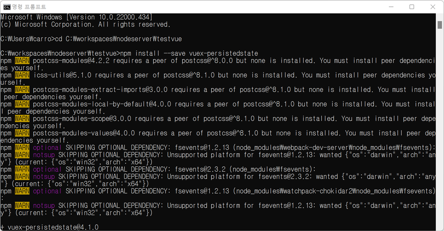 Vue 프로젝트에 vuex-persistedstate를 설치하기 위해 콘솔에서 npm install 명령어를 실행합니다.