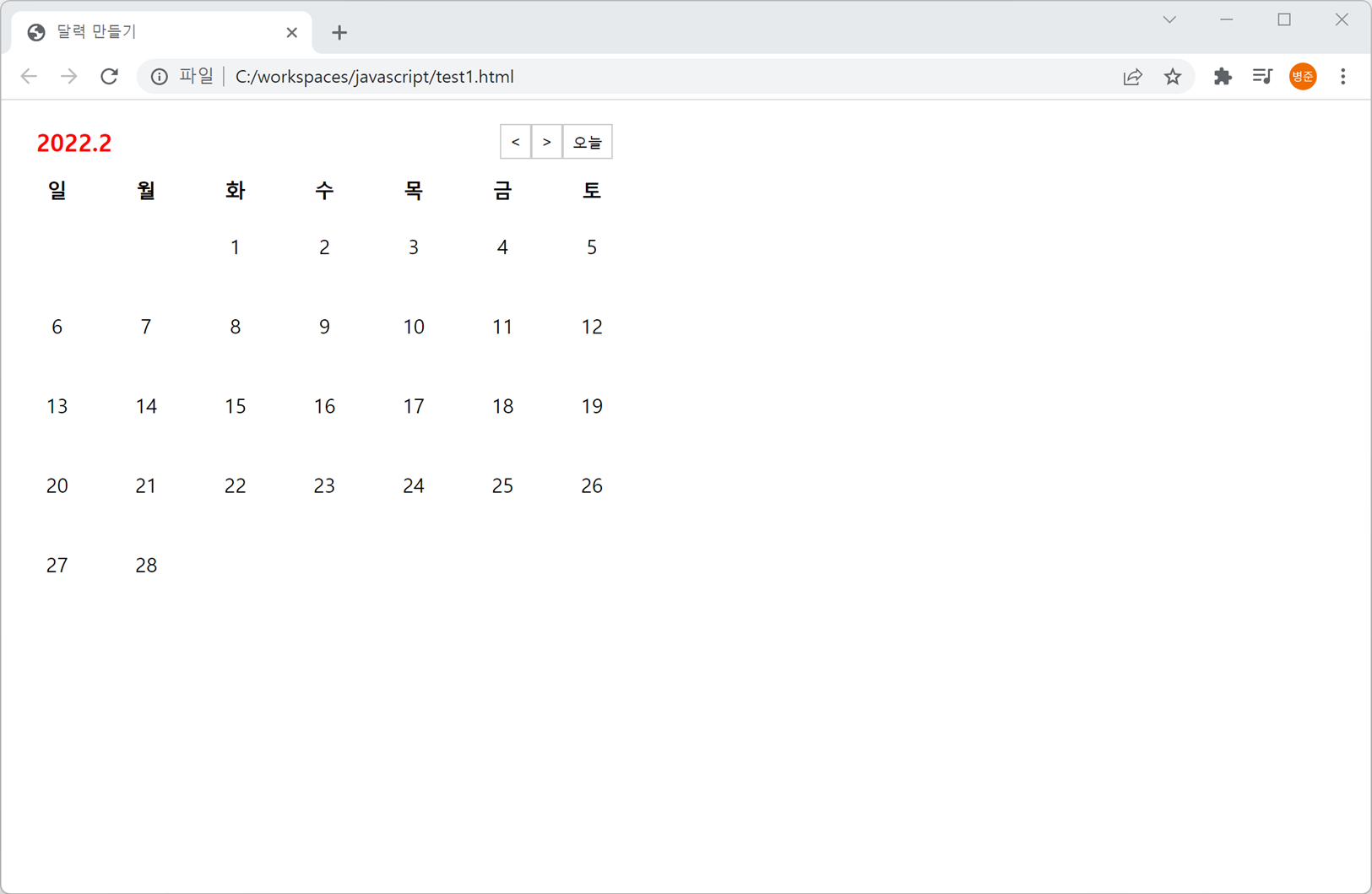 년과 월을 표시할 <span> 태그를 추가하고 이전 달과 다음 달로 이동할 수 있는 버튼과 오늘 날짜로 이동하는 버튼을 추가합니다.