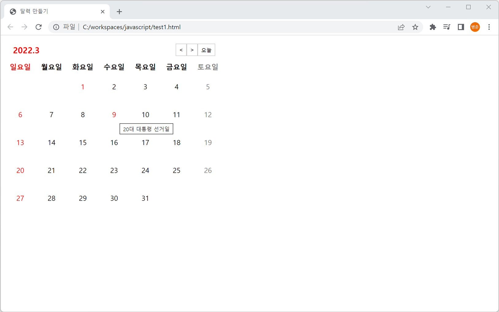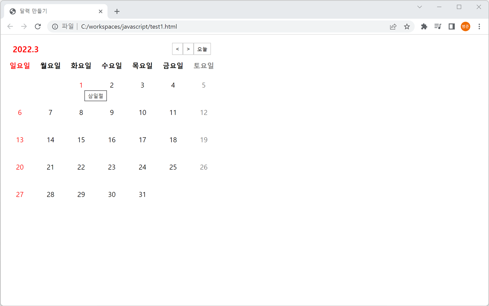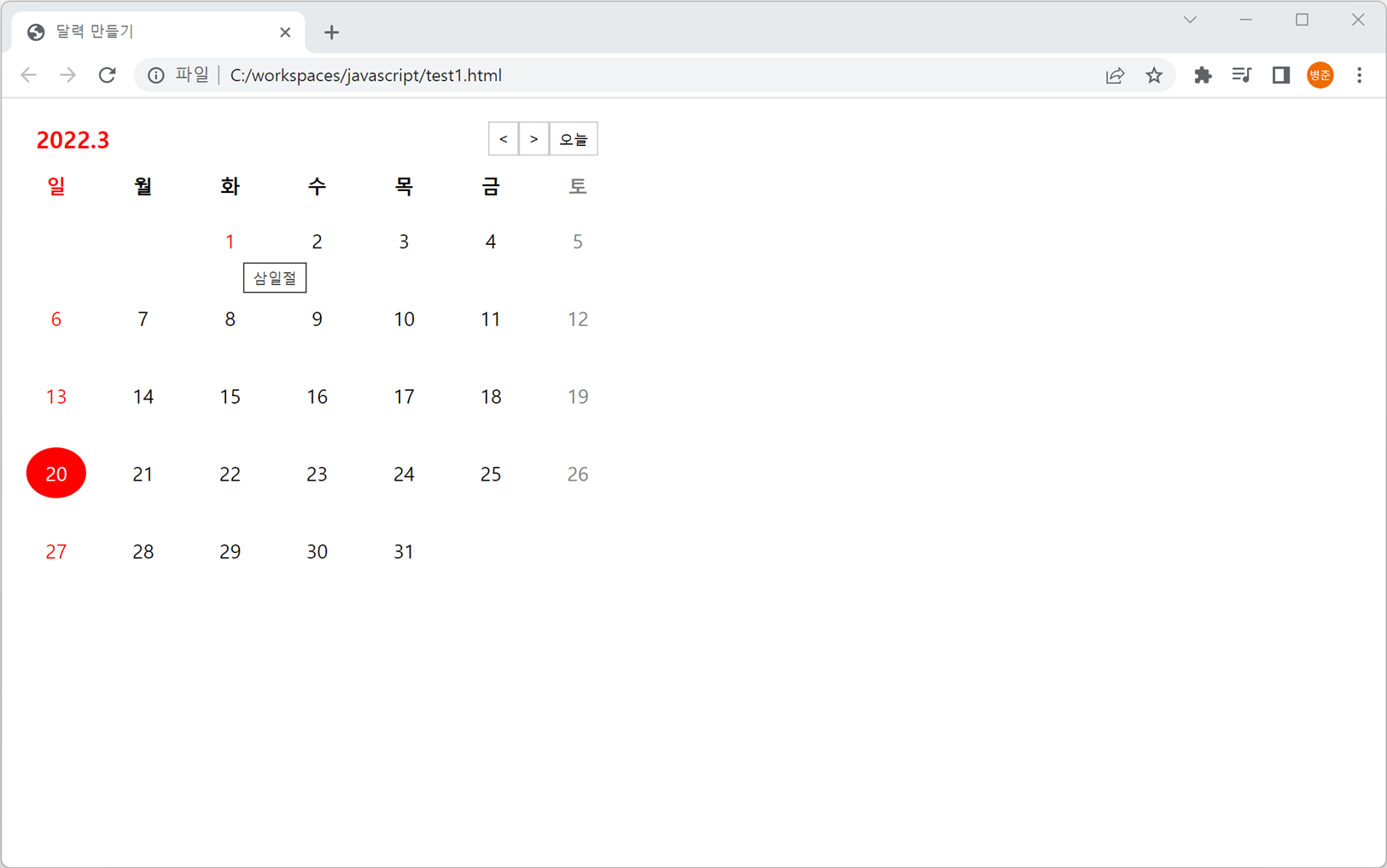 함수에 공휴일 배열을 이용하여 달력의 날짜가 공휴일과 같으면 표시되도록 추가합니다.