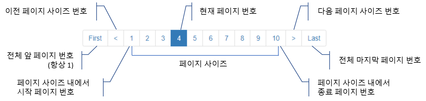 페이지 사이즈는 노출되는 페이지 번호 개 수입니다. 페이지 사이즈가 3이면 페이지 번호가 3개만 노출되고 페이지 사이즈가 5이면 페이지 번호가 5개만 노출됩니다. 페이지 사이즈는 기본적으로 10입니다.