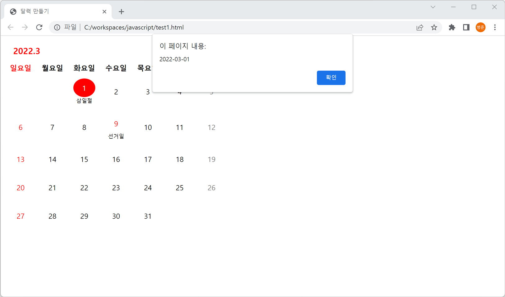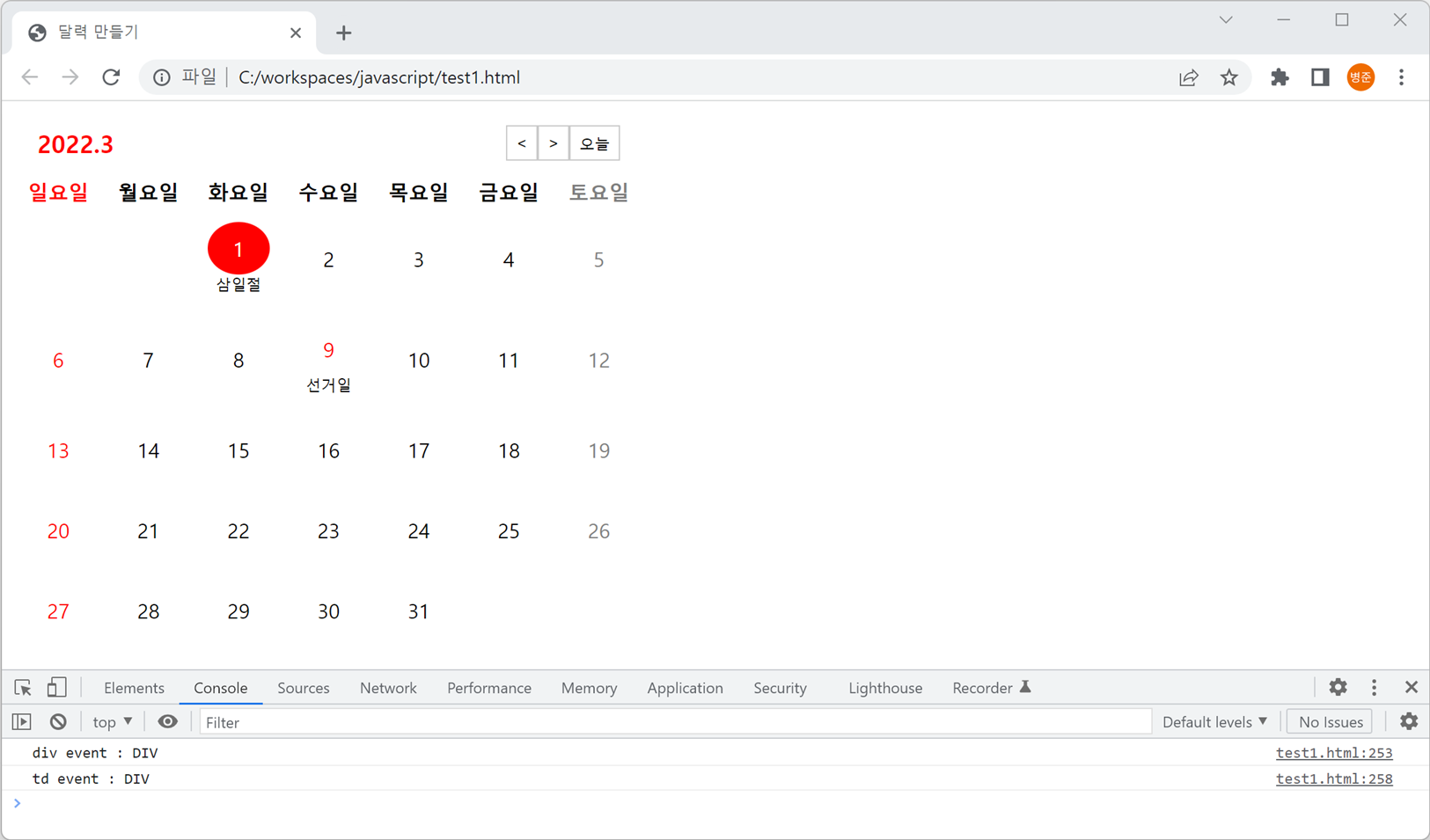 날짜 안에 있는 삼일절(공휴일)을 클릭하면 <div> 태그에만 이벤트가 발생됩니다.