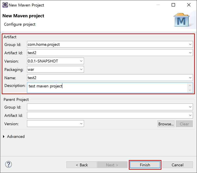 "Artifact Id"는 "test2"로 하였습니다. 전체적으로는 "com.home.project.test2"가 됩니다.