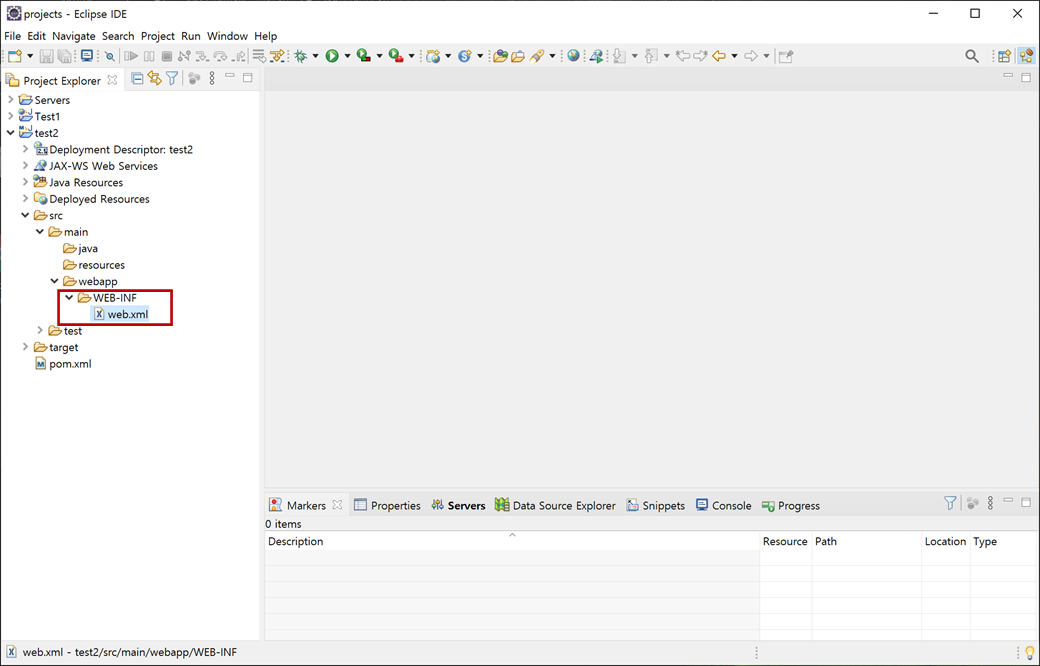 "Project Explorer"에 "test2"으로 웹 프로젝트가 생성됩니다.