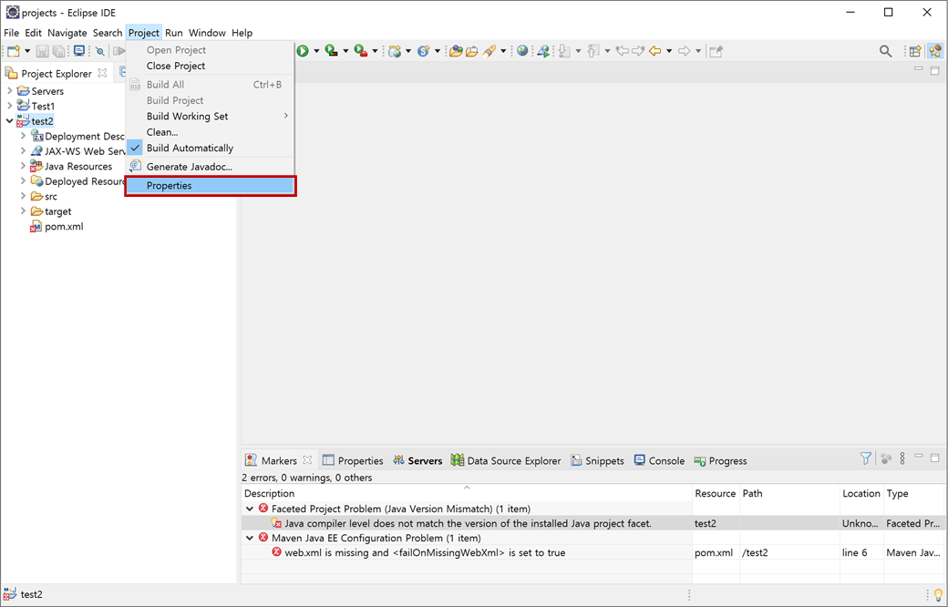"Project Explorer"의 "test2"에서 오른쪽 버튼을 클릭하여 컨텍스트 메뉴 [Java EE Tools > Generate Deployment Descriptor Sub]를 클릭합니다.