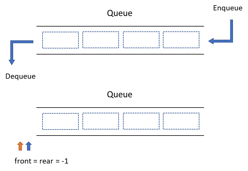 프로그램에서는 버퍼를 사용하기 때문에 방향의 개념이 없습니다. 그래서 데이터를 넣는 위치를 rear로 데이터를 가져오는 위치를 front로 사용합니다. 그리고 데이터를 넣는 것을 인큐(Enqueue), 데이터를 가져오는 것을 디큐(Dequeue)라고 합니다.