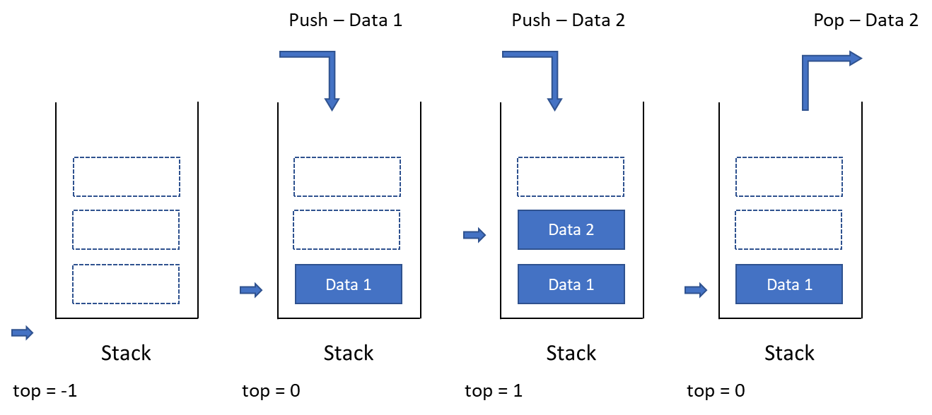 스택에 데이터를 추가하기 위해서 top의 위치에 1을 더한 후 데이터를 추가합니다. 그리고 스택에서 데이터를 가져오기 위해서는 top의 위치에 데이터를 가져오고 top에서 1을 뺍니다. top이 -1이면 스택에 데이터가 없는 상태이고 top의 위치가 스택의 마지막 위치와 같으면 더 이상 스택에 데이터를 넣을 수 없는 포화 상태입니다.