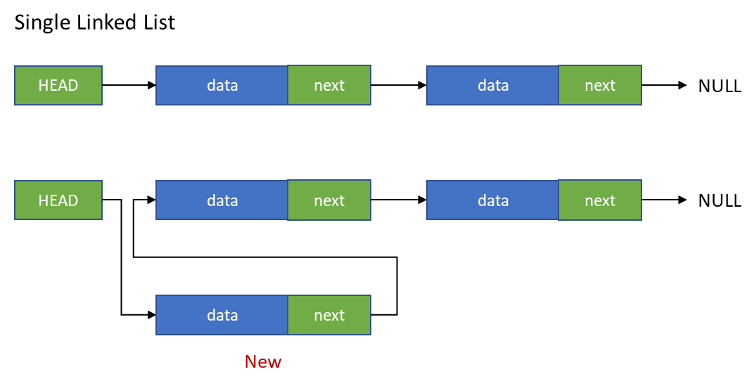 맨 앞에 노드를 추가하기 위해서는 HEAD와 연결된 노드(Node) 객체를 생성된 노드(Node) 객체의 다음 노드로 참조시킵니다. 그리고 HEAD에 생성된 노드(Node) 객체를 참조시킵니다.