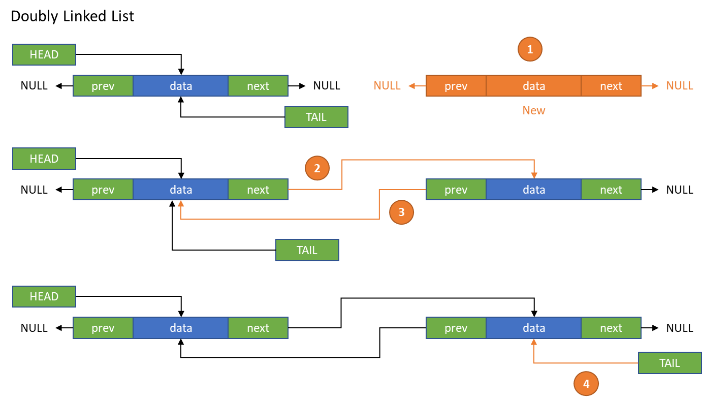 연결 리스트의 뒤에 노드를 추가할 때는 TAIL이 참조하는 노드(마지막 노드)의 다음 노드(nextNode)에 생성된 노드를 참조시키고 생성된 노드의 이전 노드(prevNode)에 마지막 노드를 참조시킵니다. 그리고 생성된 노드를 TAIL에 참조시킵니다.