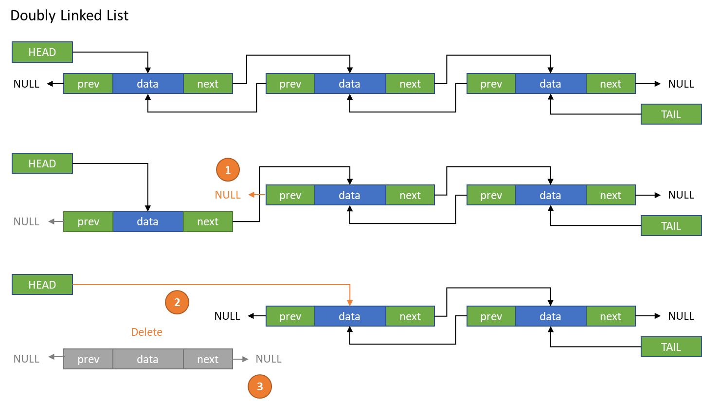 연결 리스트의 앞에 노드를 삭제할 때는 HEAD가 참조하는 노드(맨 앞 노드)의 다음 노드(nextNode)가 NULL이 아니면 맨 앞 노드의 다음 노드(nextNode)의 이전 노드(prevNode)를 NULL 처리하고 HEAD에 맨 앞 노드의 다음 노드(nextNode)를 참조시키고 맨 앞 노드의 다음 노드(nextNode)를 NULL 처리합니다. 만약 맨 앞 노드의 다음 노드(nextNode)가 NULL이면 노드가 하나만 있는 상태이므로 HEAD와 TAIL를 NULL 처리하여 연결된 노드가 없는 빈 상태(Empty)로 만듭니다.