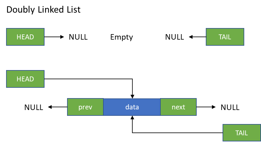 연결 리스트의 앞이나 뒤에 노드를 추가할 때는 HEAD와 TAIL이 NULL이면 연결된 노드가 없는 빈 상태(Empty)입니다. 그래서 생성된 노드를 HEAD와 TAIL에 참조시킵니다.