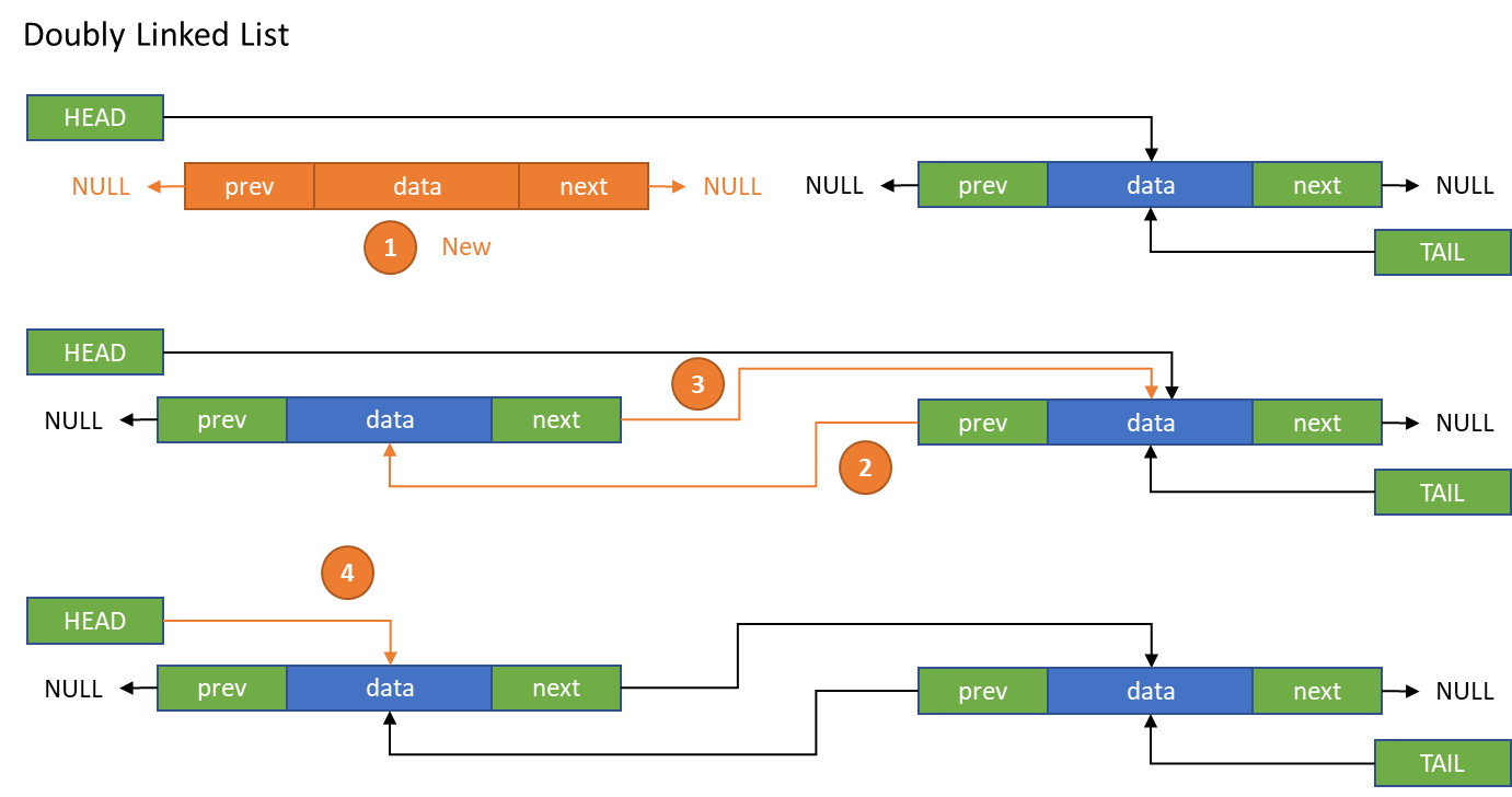 첫 번째 노드(Node)에 이전 포인터(prev)는 HEAD가 아닌 NULL입니다.