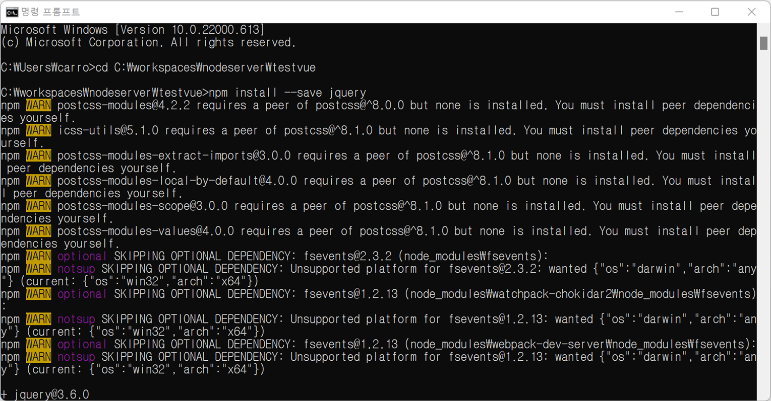 Vue 프로젝트에 jQuery를 설치하기 위해 콘솔에서 npm install 명령어를 실행합니다.