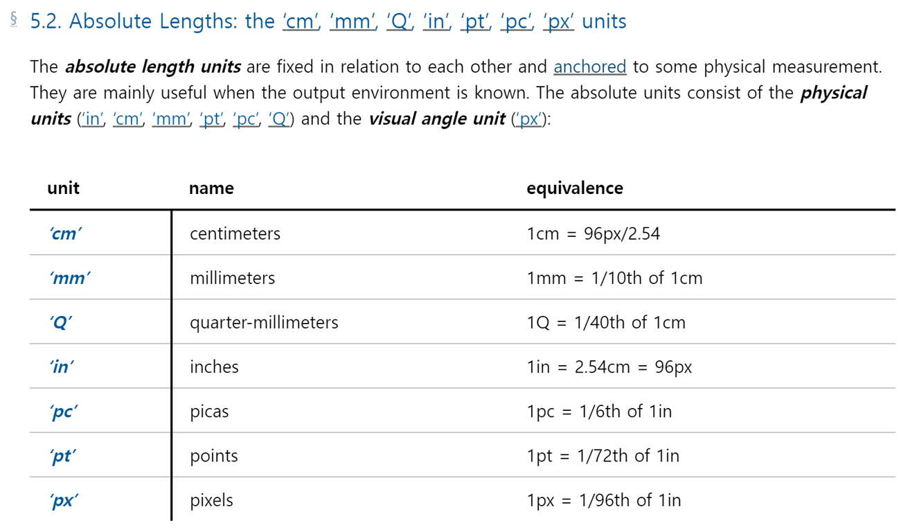 W3C(World Wide Web Consortium - 월드 와이드 웹 컨소시엄)에서는 단위에 대한 크기를 지정해 두었습니다.