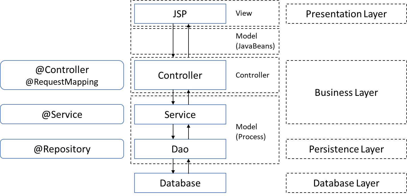 Architecture Pattern(계층화된 아키텍처 패턴)에서는 JSP는 Presentation Layer(프리젠테이션 레이어), Controller과 Service는 Business Layer(비즈니스 레이어), Dao는 Persistence Layer(퍼시스턴스 레이어), Database는 Database Layer(데이터베이스 레이어)입니다.