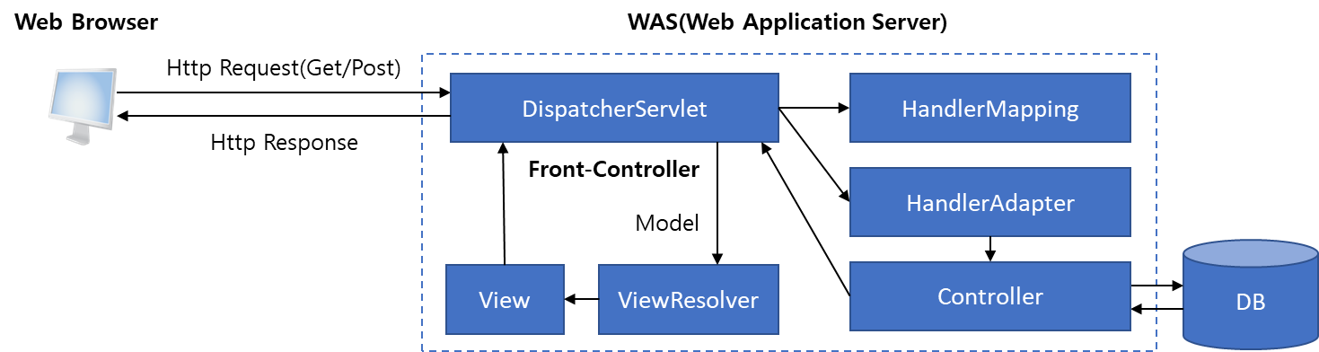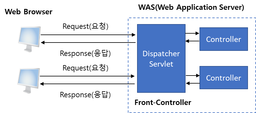 이처럼 DispatcherServlet은 Central Servlet(중앙 서블릿)으로 Front Controller Pattern(프론트 컨트롤러 패턴)을 적용하여 설계되고 개발되었습니다. 그래서 DispatcherServlet을 Front Controller이라고 합니다.