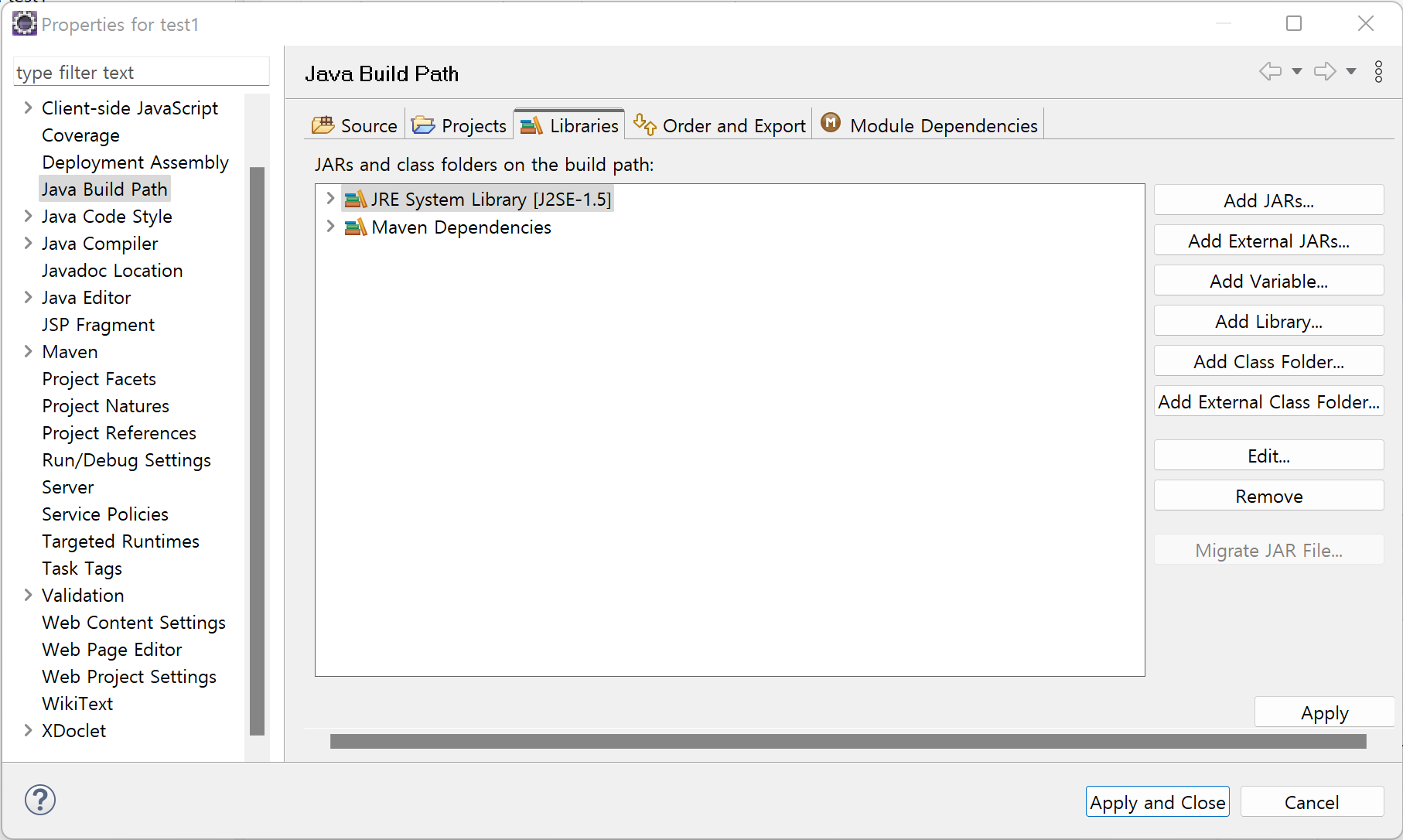 이럴 때는 Java Build Path에서 Libraries 탭의 "JRE System Libary [J2SE-1.5]"를 선택하고 Edit 버튼을 클릭합니다.