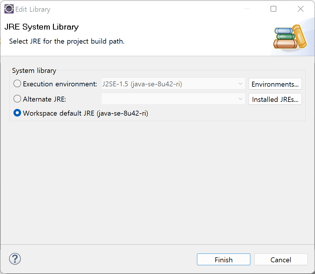 Edit Library 창의 System library에서 Execution environment로 JavaSE-1.8 (java-se-8u42-ri)를 선택하거나 Workspace default JRE (java-se-8u42-ri)를 선택하고 Finish 버튼을 클릭합니다.